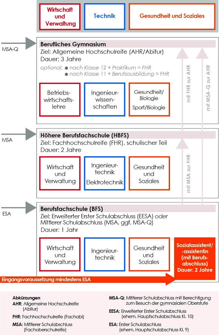 Sollten Sie sich schon jetzt informieren wollen, welcher Bildungsgang am besten zu Ihnen passt, bietet Ihnen die Übersicht der Bildungsgänge, der Voraussetzungen und angestrebten Abschlüsse sicherlich einen ersten Überblick. (siehe unten)